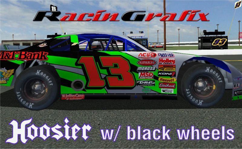 This MIP features Hoosier tires and black wide-5 wheels taken from real Late Models. Installation instructions in READ ME that is included.