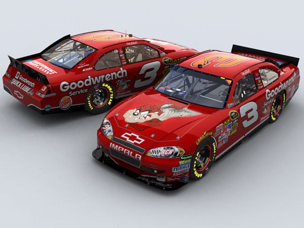 This special paint scheme was for the 2000 Daytona 500 and shows the Tasmanian Devil on the hood. Dale and Dale Jr made a string of commercials with Taz, the most popular of which (IMHO) had Dale teaching Taz to drive while Jr sat in the passenger seat.